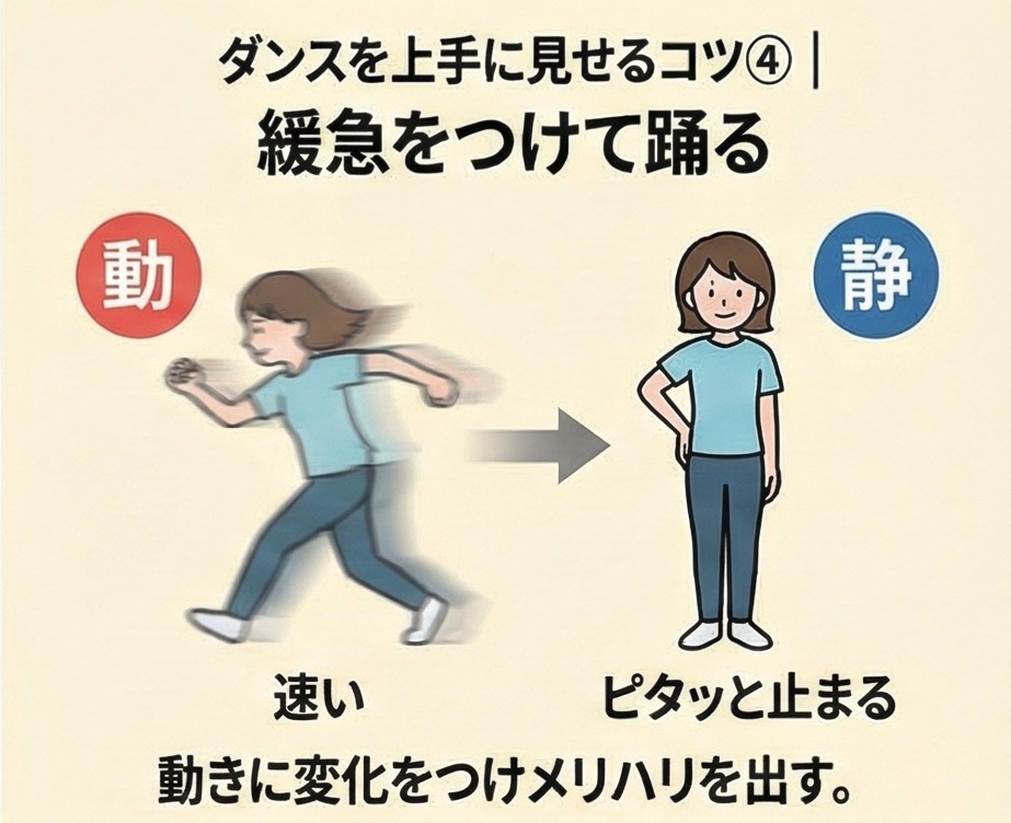 緩急をつけて踊ると、ダンスが上手に見えます。動きに変化を入れるとダンスにメリハリが出るので、初心者のイメージを払拭できるからです。