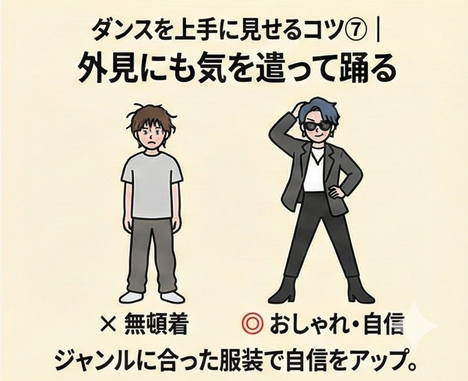 さらに、外見に気を遣うことは自分に対してもプラスの効果があります。身なりを整えたことで自分に自信が持てるようになり、気分良く踊れるはずです。