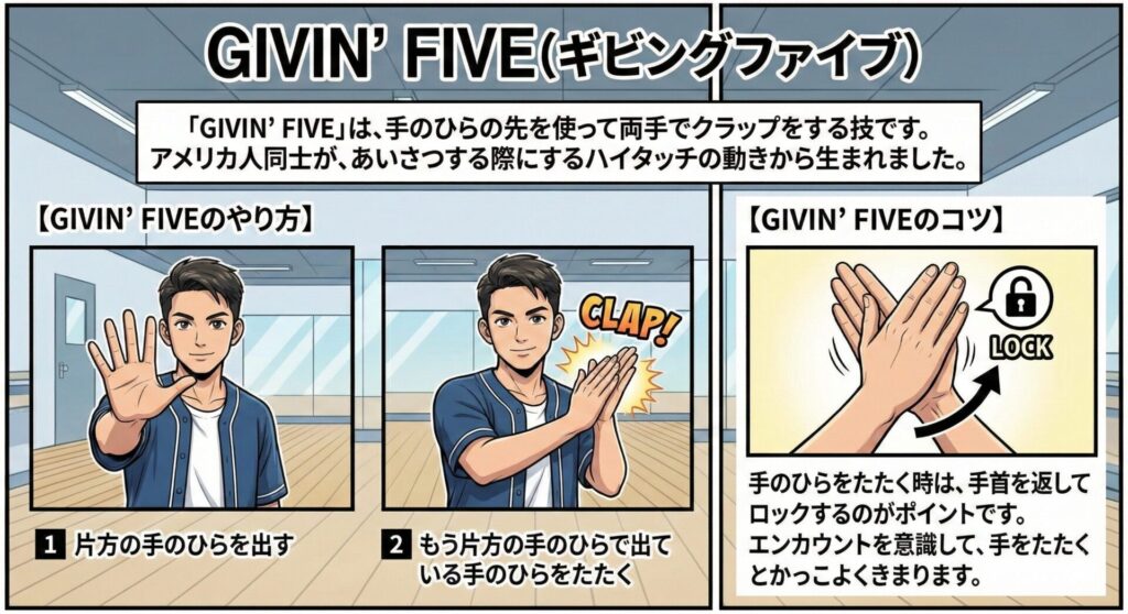 「GIVIN’ FIVE」は、手のひらの先を使って両手でクラップをする技です。アメリカ人同士が、あいさつする際にするハイタッチの動きから生まれました。