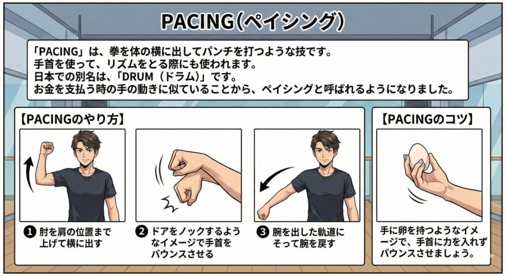 「PACING」は、拳を体の横に出してパンチを打つような技です。手首を使って、リズムをとる際にも使われます。