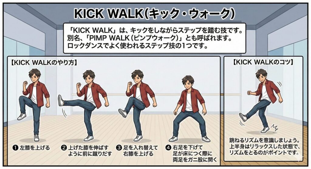 「KICK WALK」は、キックをしながらステップを踏む技です。別名、「PIMP WALK(ピンプウォーク)」とも呼ばれます。ロックダンスでよく使われるステップ技の1つです。