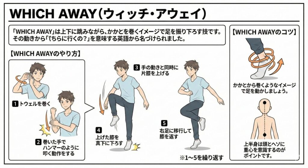 「WHICH AWAY」は上下に跳みながら、かかとを巻くイメージで足を振り下ろす技です。その動きから「右・左どちらに行くの?」を意味する英語から名づけられました。