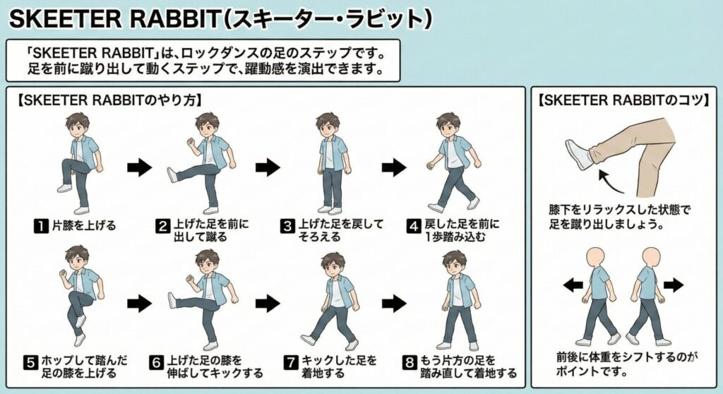 「SKEETER RABBIT」は、ロックダンスの足のステップです。足を前に蹴り出して動くステップで、躍動感を演出できます。