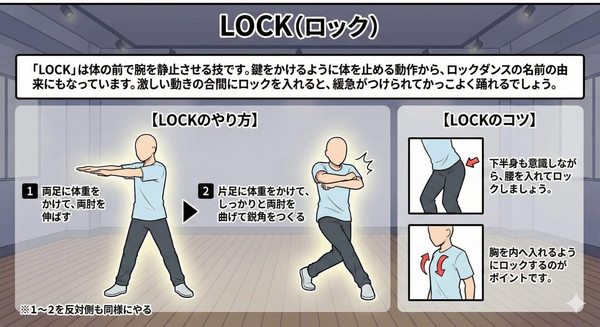 「LOCK」は体の前で腕を静止させる技です。鍵をかけるように体を止める動作から、ロックダンスの名前の由来にもなっています。