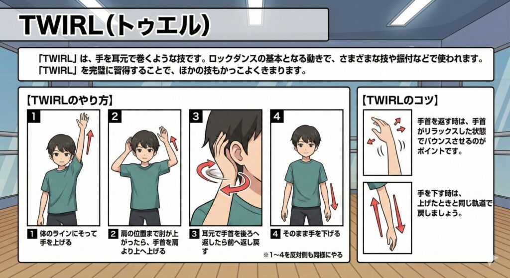 「TWIRL」は、手を耳元で巻くような技です。ロックダンスの基本となる動きで、さまざまな技や振付などで使われます。「TWIRL」を完璧に習得することで、ほかの技もかっこよくきまります。
